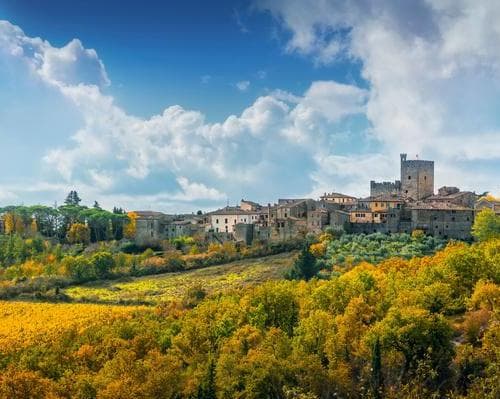 Castellina in Chianti ligger inbäddat i hjärtat av vinregionen Chianti och är en pittoresk toskansk stad som utan ansträngning blandar rik historia, fantastiska landskap och utsökt mat. När du närmar dig denna charmiga destination kommer du att mötas av böljande kullar täckta av vingårdar och olivlundar, vilket skapar förutsättningar för en typisk italiensk flykt. Stadens medeltida arkitektur, smala kullerstensgator och livliga piazzor inbjuder dig att ta lugna promenader och fördjupa dig i dess tidlösa skönhet. Ett besök i Castellina in Chianti skulle inte vara komplett utan att utforska dess historiska landmärken. Börja din resa på Rocca di Castellina, en fästning från 1300-talet som erbjuder panoramautsikt över den omgivande landsbygden. Fästningen hyser också det arkeologiska museet i Chianti Senese, där du kan fördjupa dig i regionens etruskiska rötter och upptäcka en imponerande samling artefakter. Ett annat måste att se är Via delle Volte, en gammal täckt passage som går under stadens huvudgata och ger en unik inblick i Castellinas förflutna. Vinentusiaster kommer att befinna sig i paradiset, eftersom Castellina in Chianti är känt för sin produktion av Chianti Classico. Många vingårdar och vingårdar öppnar sina dörrar för turer och provningar, så att du kan njuta av några av de finaste vinerna i Italien. Missa inte chansen att besöka de lokala enotecas, där kunniga sommelierer kan guida dig genom de olika smakerna och egenskaperna hos regionens viner. Para ihop din smakupplevelse med traditionella toskanska rätter på en av stadens rustika trattorior eller exklusiva restauranger, där du kan njuta av läckerheter som ribollita, bistecca alla fiorentina och pappardelle al cinghiale. För dem som söker lite äventyr erbjuder den omgivande landsbygden stora möjligheter till utomhusaktiviteter. Vandrings- och cykelleder slingrar sig genom det natursköna landskapet och erbjuder hisnande vyer vid varje sväng. Du kan också ta en lugn biltur längs Chiantigiana-vägen, som förbinder Castellina in Chianti med andra förtrollande städer i regionen, som Radda in Chianti och Greve in Chianti. Oavsett om du är en historiefantast, en vinälskare eller bara letar efter lugn, lovar Castellina in Chianti en oförglömlig upplevelse som fångar Toscanas essens.
